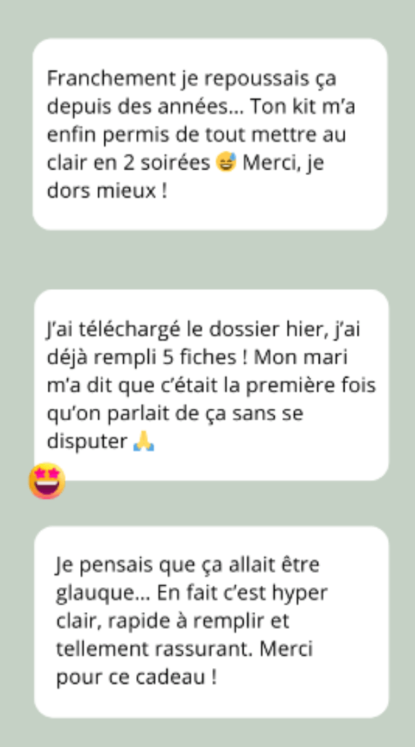 “J’ai rempli le dossier en 1 semaine. Je pensais que ce serait plombant, mais en fait ça m’a fait du bien. Et maintenant je sais que si demain je disparais, mes enfants ne seront pas perdus. Rien que pour ça, je respire mieux.”