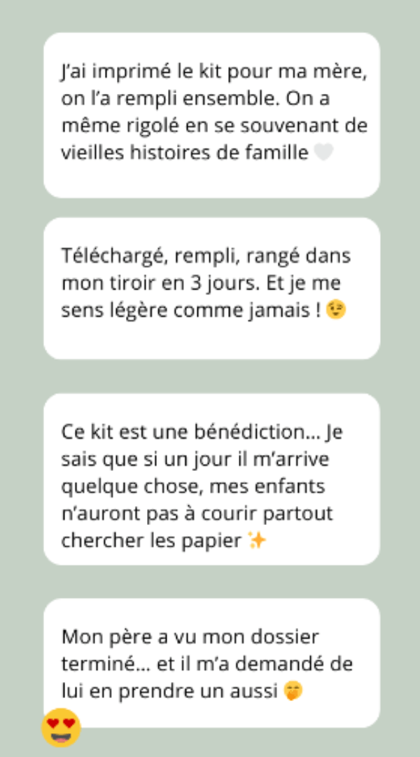 “Franchement ? J’ai pris ce dossier pour ma mère… et j’ai fini par le remplir pour moi. J’ai compris que si un jour je me fais écraser par un bus, je préfère qu’on pense à moi avec tendresse qu’avec une facture dans les mains."